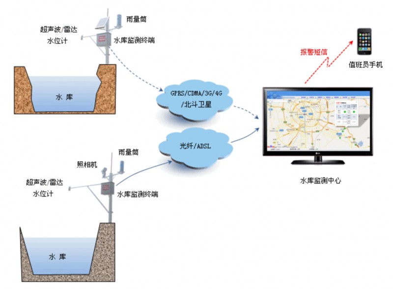 水雨情自動(dòng)監(jiān)測(cè)系統(tǒng)主要實(shí)現(xiàn)水情、雨情全過程的遠(yuǎn)程自動(dòng)采集、拍照監(jiān)視,實(shí)時(shí)記錄河道、水庫(kù)、渠道水位的動(dòng)態(tài)變化過程。系統(tǒng)根據(jù)監(jiān)測(cè)水位及警戒水位、汛限水位,時(shí)段降雨量、日累計(jì)降雨量實(shí)現(xiàn)聲音、顏色、短信的防汛排洪預(yù)警功能。